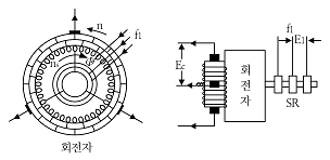 그림의 정류자형 주파수 변환기의 전기자 권선에 슬립링(SR)을 통해 주파수 f1의 교류 전압을 인가하고, 전기자를 회전자계