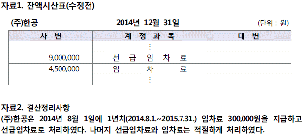 다음은 (주)한공의 2014년 12월 31일 수정전 잔액시산표의 일부와 결산정리사항을 나타낸 것이다. 결산정리사항을 반영한 후의 선급임차료와 임차료 금액으로 옳은 것은?(순서대로 선급임차료, 임차료)