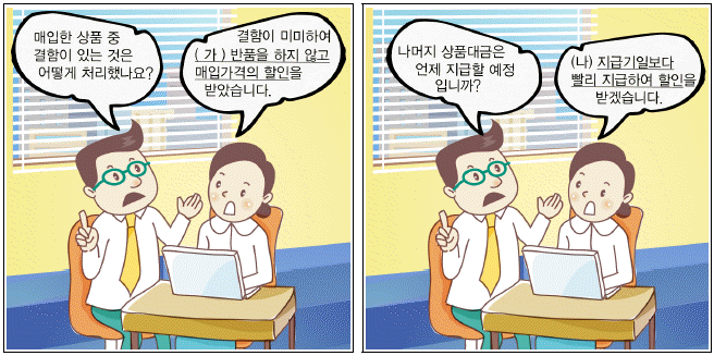 다음은 (주)한공의 재고자산 매입과 관련된 박부장과 이대리의 대화내용이다. 다음 대화에서 (가), (나)에 해당하는 계정과목으로 알맞은 것은?(순서대로 가, 나)