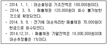 (주)한공의 매출채권과 대손에 관한 2014년도 자료는 다음과 같다. 2014년도 손익계산서에 계상될 대손상각비는 얼마인가?