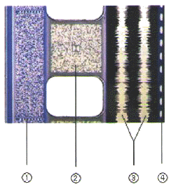 다음은 35mm 필름의 사운드트랙 사진이다. 사진의 2번에 해당하는 음향포맷은 무엇인가?