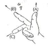 그림은 플레밍 오른손 법칙을 나타낸 것이다. (A), (B), (C)가 가르키는 것은?