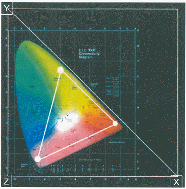 아래의 그림은 1931년 CIE가 제시한 표준 색좌표이다. 아래의 보기에서 틀린 것은?