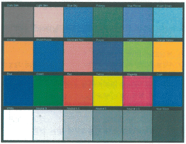 아래의 그림은 맥베스 차트(macbeth chart)이다. 그림에서 3번째 줄에 위치한 Blue, Green, Yellowm Magenta, Cyan에 White를 더하여 DLP의 컬러 공간을 만든 것을 무엇이라 하는가?