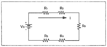 다음 회로에서 Vs = 15[V], R1 = 10[Ω], R2 = 20[Ω], R3 = 30[Ω], R4 = 40[Ω], R5 = 50[Ω] 일 때 전류 I는 얼마인가?