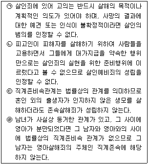 살인의 죄에 대한 설명이다. 아래 ㉠부터 ㉣까지의 설명 중 옳고 그름의 표시(O, X)가 바르게 된 것은?(다툼이 있는 경우 판례에 의함)