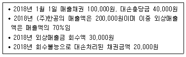 다음은 (주)한공의 2018년도 재무제표의 일부이다. 2018년도 기말재무상태표상매출채권 및 대손충당금은 각각 얼마인가? (순서대로 매출채권, 대손충당금)