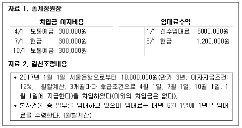 다음은 (주)한공의 2017년 결산조정 전 차입금 이자비용과 임대료수익에 대한 총계정원장과 결산조정내용이다.