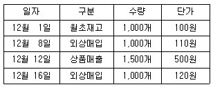다음은 (주)한공의 12월 중 상품 매매 자료이다. 재고자산의 평가방법으로 이동평균법과 총평균법을 적용할 때 12월말 상품재고액으로 옳은 것은? (순서대로 이동평균법, 총평균법)