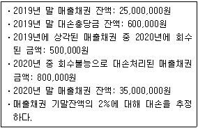 다음은 (주)한공의 매출채권 및 대손 관련 자료이다. 2020년도 손익계산서에 계상될 대손상각비 합계액은 얼마인가?