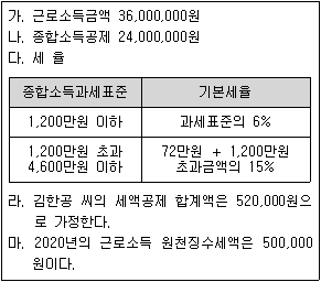 다음은 (주)한공에 근무하는 거주자 김한공 씨의 2020년도 연말정산과 관련된 자료이다. 연말정산에 의한 소득세 환급세액은 얼마인가? 단, 주어진 자료 외에는 고려하지 않는다.