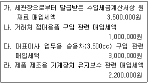 다음은 일반과세자인 (주)한공(전자제품 제조업)의 2020년 제1기 부가가치세 예정신고기간의 내역이다. 이 중 부가가치세 매출세액에서 공제 가능한 부가가치세 매입세액은 얼마인가? (단, 세금계산서는 적법하게 수취하였고, 매입세액을 공제받기 위한 절차를 모두 이행하였다.)
