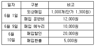 다음은 (주)한공의 2021년 6월 중 상품 취득 관련 자료이다. 6월말 현재 상품의 취득원가는 얼마인가?