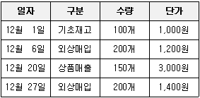 다음은 (주)한공의 12월 중 상품 매매 자료이다. 재고자산의 평가방법을 총평균법으로 적용한 경우 기말재고는 얼마인가?