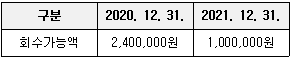(주)한공은 2020년 1월 1일 기계장치를 3,000,000원에 취득(내용연수 5년, 잔존가치는 0원)하였다. (주)한공은 동 기계장치를 원가모형을 적용하여 정액법으로 감가상각하였다. 매 회계연도 말 기계장치에 대한 회수가능액은 다음과 같으며 회수가능액 변동은 기계장치의 손상에 따른 것이다. 2021년도 재무제표에 인식될 기계장치의 손상차손 금액은 얼마인가?
