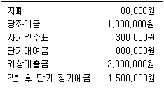 다음은 기말시점에 (주)한공이 보유하고 있는 자산의 일부 내역이다. 재무상태표에 표시될 현금 및 현금성자산은 얼마인가?