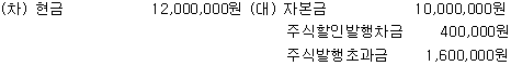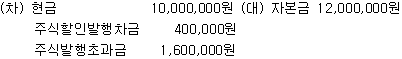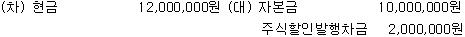 (주)한공은 자본증자를 위해 보통주 1,000주를 주당 12,000원(액면금액 주당 10,000원)에 발행하고, 주금은 현금으로 납입받았다. 다음 주식발행에 대한 회계처리 중 옳은 것은? (자본증자일 현재 주식할인발행차금의 장부금액은 400,000원이다.)