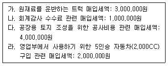 다음 중 제조업을 영위하는 일반과세자인 (주)한공의 부가가치세 신고 시 매출세액에서 공제받을 수 있는 매입세액은 얼마인가? 세금계산서는 적법하게 수취하였으며, 매입세액을 공제받기 위한 절차를 모두 이행하였다고 가정한다.