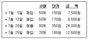 (주)한공은 당기 7월 중 처음 상품을 매입하여 판매하였다. 다음은 7월 중 상품의 매입 및 매출거래 내역이다. 7월말 상품재고액과 7월 매출원가는 얼마인가? (단, 회사는 선입선출법에 따라 단가를 결정하고 있다.) (순서대로 상품재고액, 매출원가)