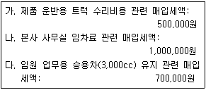 다음은 (주)한공의 2020년 2기 예정신고기간에 발생한 매입세액의 내역이다. 매출세액에서 공제 가능한 매입세액을 계산하면 얼마인가? (단, 세금계산서는 적법하게 수취하였다.)