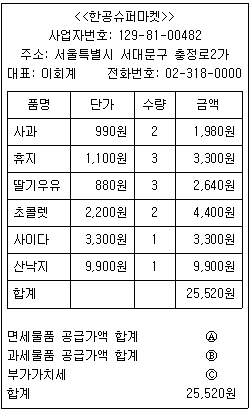 다음은 김한공 씨가 슈퍼마켓에서 구입한 영수증의 일부이다. 빈칸에 들어갈 금액은 각각 얼마인가?