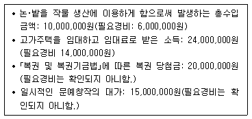 다음은 거주자 김한공 씨의 2019년 소득 내역이다. 이를 토대로 김한공 씨의 종합소득 과세대상 소득금액을 계산하면 얼마인가?