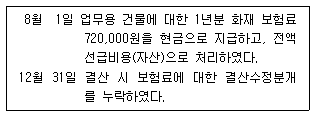다음은 (주)한공의 보험료 관련 자료이다. 결산수정분개를 누락한 결과가 재무제표에 미치는 영향으로 옳은 것은? (월할계산 가정)