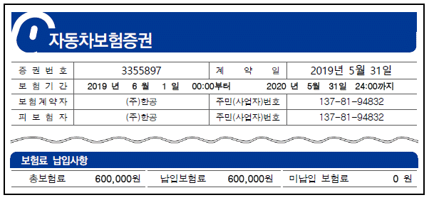 다음은 (주)한공이 업무용 차량에 대하여 가입한 임직원 전용 자동차보험증권이다. 2019년도 손익계산서에 표시될 보험료 금액은 얼마인가? (월할계산하기로 한다.)