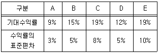 상호배타적 포트폴리오인 A, B, C, D, E의 기대수익률과 수익률의 표준편차는 다음과 같다.