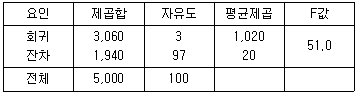 회귀분석을 실시한 결과 다음의 분산분석표를 얻었다. 결정계수는 얼마인가?