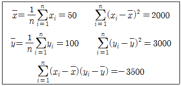 단순회귀모형 Yi=α+βxi+εi,(i=1,2,⋯,n) 가정하에 자료를 분석하기로 하였다. 각각의 독립변수 xi에서 반응변수 Yi를 관측하여 정리한 결과가 다음과 같을 때, 회귀계수 α,β의 최소제곱 추정값을 순서대로 나열한 것은?