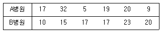 다음은 A병원과 B병원에서 각각 6명의 환자를 상대로 환자가 병원에 도착하여 진료서비스를 받기까지의 대기시간(단위:분)을 조사한 것이다. 두 병원의 진료서비스 대기시간에 대한 비교로 옳은 것은?