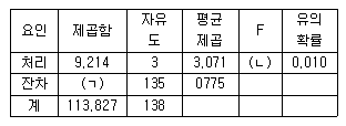 다음 분산분석표의 ( )에 들어갈 값으로 옳은 것은?