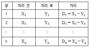 어떤 처리 전후의 효과를 분석하기 위한 대응비교에서 자료의 구조가 다음과 같다.