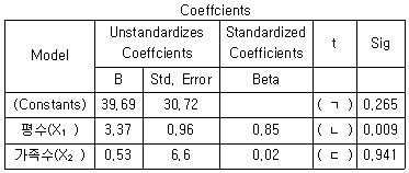 = 39.69+3.37X1+0.53X2 의 회귀계수표이다. 다음 ( )에 알맞은 값은?