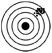 척도의 신뢰도와 타당도의 관계를 표적과 탄착에 비유한 다음 그림에 해당하는 척도의 특성은?