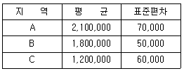 A 지역, B 지역, C 지역의 가구당 소득을 조사하여 분석한 결과가 다음과 같을 때, 3개지역의 변이계수를 비교한 결과로 옳은 것은?