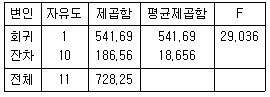 단순선형회귀모형 y=β0+β1x+ϵ을 고려하여 자료들로부터 다음과 같은 분산분석표를 얻었다. 이 때 결정계수는 얼마인가?