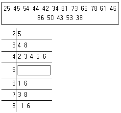 다음의 자료로 줄기-잎 그림을 그리고 중앙값을 찾아보려 한다. 빈 칸에 들어갈 잎과 중앙값을 순서대로 바르게 나열한 것은?