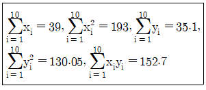 단순회귀분석을 적용하여 자료를 분석하기 위해서 10쌍의 독립변수와 종속변수의 값들을 측정하여 정리한 결과 다음과 같은 값을 얻었다. 회귀모형 Yi=α+βxi+ϵ의 β의 최소제곱추정향을 구하면?