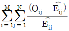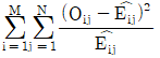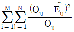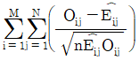 행변수가 M개의 범주를 갖고 열변수가 N개의 범주를 갖는 분할표에서 행변수와 열변수가 서로 독립인지를 검정하고자 한다. (i, j)셀의 관측도수를 Oij, 귀무가설 하에서의 기대도수의 추정치를 라 할 때, 이 검정을 위한 검정통계량은?