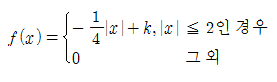 연속형 확률변수 X의 확률밀도함수가 다음과 같을 때 상수 k값과 P(|X|>1)을 순서대로 구하면?