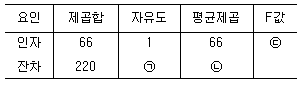 관측값 12개를 갖고 수행한 단순회귀분석에서 회귀직선의 유의성 검정을 위해 작성된 분산분석표가 다음과 같다. ㉠~㉢에 해당하는 값은?