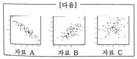 다음은 3개의 자료 A, B, C에 대한 산점도이다. 이 자료에 대한 상관계수가 -0.93, 0.20, 0.70 중 하나일 때, 산점도와 해당하는 상관계수의 값을 올바르게 짝지은 것은?