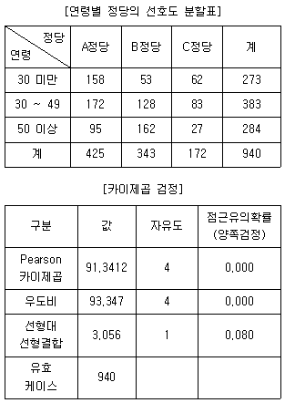 어느 지역의 유권자 중 940명을 임의로 추출하여 가장 선호하는 정당을 조사한 결과를 연령대별로 정리하여 다음의 이차원 분할표를 얻었고, 분할표 분석결과는 다음과 같다. 유의수준 0.05에서 연령대와 선호하는 정당과의 관련성을 검정하기 위한 검정결과에 대한 해석으로 맞는 것은?