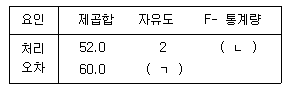 세 그룹의 평균을 비교하기 위해 각 수준에서 5번식 반복 실험한 일원분산분석 모형 Xij=μ+αi+Єij', i=1,2,3, j=1,2,ㆍㆍㆍ,5에 대한 분산분석표가 아래와 같을 때, (ㄱ), (ㄴ)에 들어갈 값은?