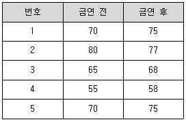 5명의 흡연자를 무작위로 선정하여 체중을 측정하고, 금연을 시킨 뒤 4주 후에 다시 체중을 측정하였다. 금연 전후의 체중에 변화가 있는가에 대해 t-검정하고자 할 때, 검정통계량의 값은?