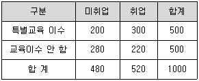 취업을 위한 특별교육프로그램을 시행한 결과 통계가 다음과 같이 집계되었다. 특별교육을 이수한 어떤 사람이 취업할 확률은?