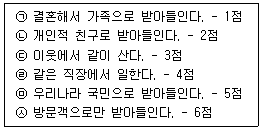 한국인이 중국인을 어느 정도 받아들이는지에 대한 조사 결과, 100명 중 30명은 ㉤번을, 70명은 ㉦번을 각각 응답하였다. 이때의 인종 간 거리계수는?