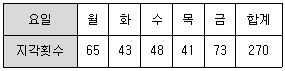 지각 건수가 요일별로 동일한 비율인지 알아보기 위해 카이제곱(χ2)검정을 실시할 경우, 이 자료에서 χ2값은?